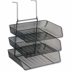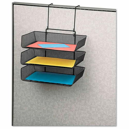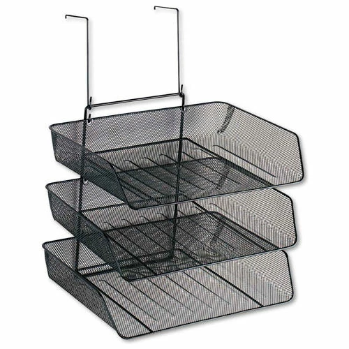 Contemporary mesh/wire panel-mount design brings office organization to a new level. Three 2″ capacity, side load letter size trays. Universal mounting bracket fits panels 1 1/2″ to 3″ thick. Wall-mountable fasteners included. Partition mount 17 7/8″ high, wall mount 11 7/8″ high. Panel Accessory Type: Organizer; Width: 11 1/8″; Depth: 14″; Height: 14 3/4″.
