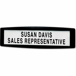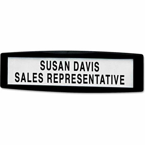 Contemporary style coupled with unique versatility. This nameplate fastens securely to any tackable partition to display names, titles or departments. 1 5/8 x 8 viewable area displays text or graphics that you customize and print. Easily repositioned with stainless steel points. Panel Accessory Type: Nameplate; Width: 9″; Depth: 3/4″; Height: 2 1/2″.