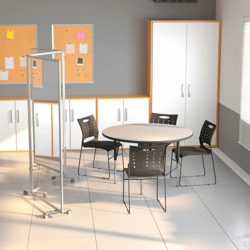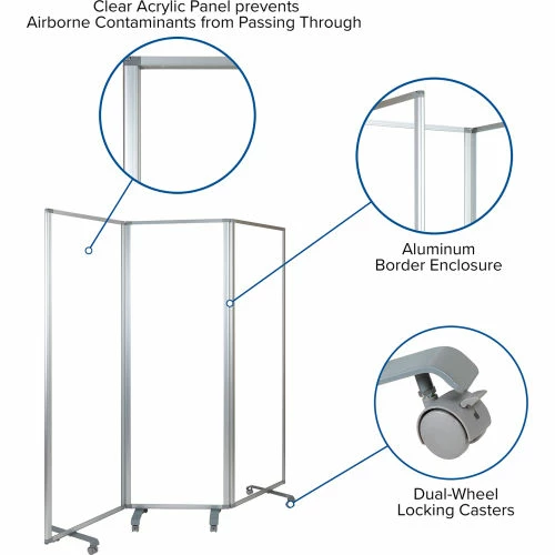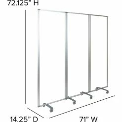 The extra-wide safety partition offers the perfect dividing space in between cubicles and open offices without obstructing views. The mobile partition can be easily moved from room to room and locked into place with locking casters. When you cannot create distances of 6 feet or wider a room divider is your best and safest choice.