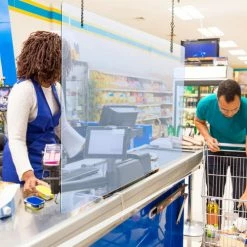 This clear hanging adjustable acrylic shield with rounded corners provides protection against sneezes, coughs and germs between employees and customers. Ideal for supermarkets, pharmacies, hospitals, stores, banks, airports, and reception desks. Or use anywhere there is a need to limit contact with third parties. Hang from the ceiling with included hanging hardware, and the chain is adjustable to your specific height needs. Can be hung Vertical or Horizontal Orientation.This plastic shield is an optimal solution to be used as a protective cashier screen, sneeze guard, cash wrap protector, germ barrier. Protect your employees from sneezes, coughs, and germs. Made in the USA.