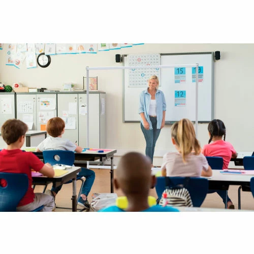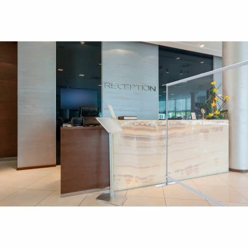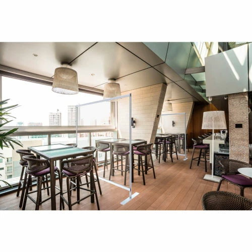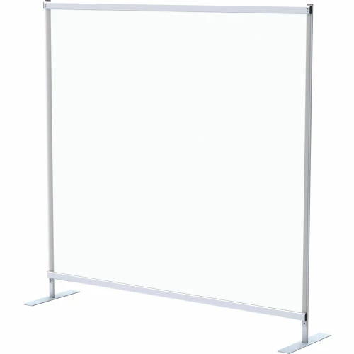 The clear PVC vinyl panel meets NFPA 701 fire resistance standards, making it safe to use anywhere in your facility. Durable vertical steel frame with aluminum cross-bars features an elegant silver powder coat finish. Lightweight and easy to install with provided hardware. Applications include restaurants between tables or carryout counters, classrooms for student teacher shielding, hotels over check-in counters, bar areas, offices between desks, and manufacturing or food processing environments between workstations. 1 Year Limited Warranty.