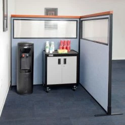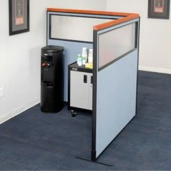 Section your office space with Interion® By Global Industrial Partition Panels. Whether you need to contain noise, enclose an office desk or block off a copy machine, these room dividers will make it easy and affordable. Partition Panels are flame retardant to meet the California 117 flammability standard. 1-3/4″ thick fabric upholstered panel features an interior engineered wood (MDF) frame and honeycomb core covered with heavy tackable liner for structural strength and support. Panel trim is finished with self-extinguishing extruded polymer that offers optimum safety and rigidity. Includes 2 Partition Panels with 5mm thick polycarbonate windows, steel T-legs for stability and all necessary hardware to create a 90 degree corner configuration. Translucent windows allow light in while still maintaining privacy, bringing an elegant and upscale look to any office space. Deluxe versions include a wood cap in cherry finish to elevate your office look. 1 Year Limited Warranty