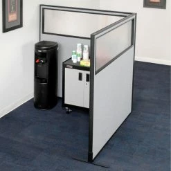 Section your office space with Interion® By Global Industrial Partition Panels . Whether you need to contain noise, enclose an office desk or block off a copy machine, these room dividers will make it easy and affordable. Partition Panels are flame retardant to meet the California 117 flammability standard. 1-3/4″ thick fabric upholstered panel features an interior engineered wood (MDF) frame and honeycomb core covered with heavy tackable liner for structural strength and support. Panel trim is finished with self-extinguishing extruded polymer that offers optimum safety and rigidity. Includes 2 Partition Panels with 5mm thick polycarbonate windows, steel T-legs for stability and all necessary hardware to create a 90 degree corner configuration. Translucent windows allow light in while still maintaining privacy, bringing an elegant and upscale look to any office space. 1 Year Limited Warranty