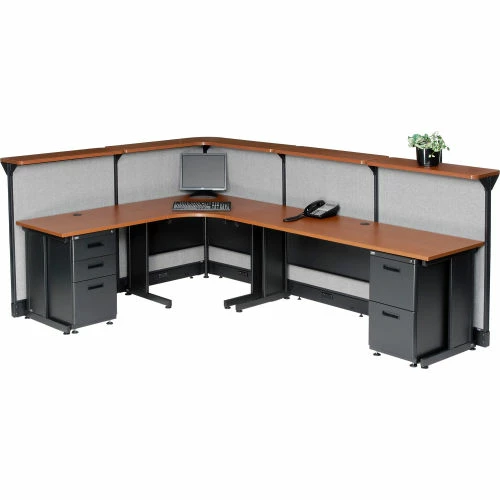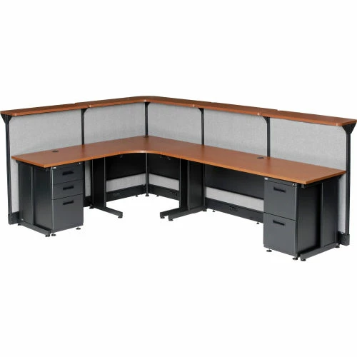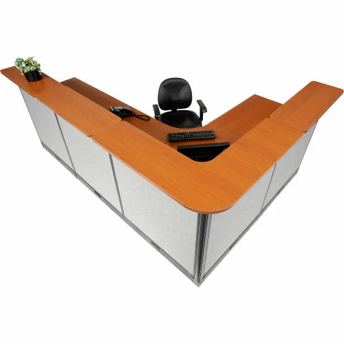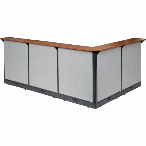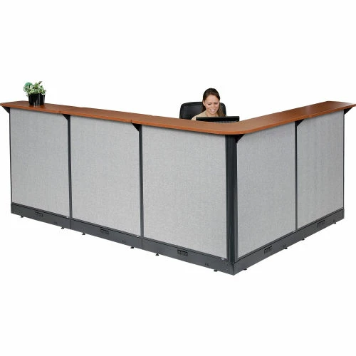 Interion By Global Industrial Interion® L-Shaped Electric Reception Station, 116"W x 80"D x 46"H, Cherry Counter Gray Panel