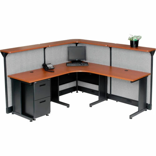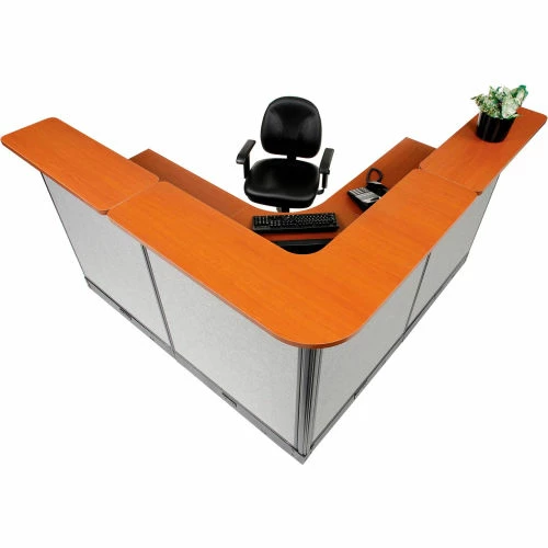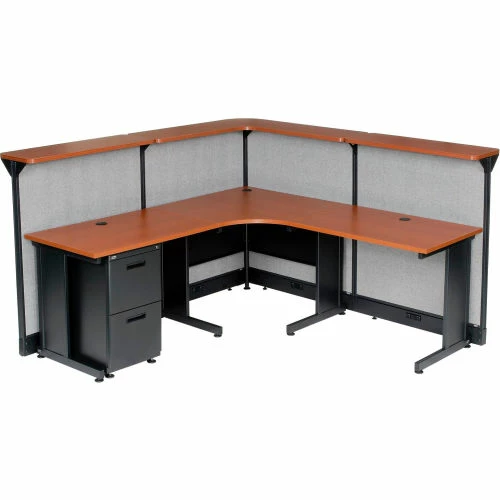 Interion By Global Industrial Interion® L-Shaped Electric Reception Station, 80"W x 80"D x 46"H, Cherry Counter Gray Panel