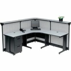 Interion® By Global Industrial reception stations with raceways allow convenient storage of wires & cables while maintaining an attractive, professional appearance. Reception stations are ideal for reception rooms and security areas. Reception counters and work surfaces are made using 1″ thick scratch resistant laminate. 12″D reception counter provides a convenient writing surface for guest and visitors while maintaining receptionist privacy. Desktops include 2-3/16″ diameter cable management grommet opening(s). Desk framing is made of Black finished steel for strength that lasts. Reception station panels consist of Interion® partitions that help reduce noise and create privacy. Reception panels are flame retardant to meet the California 117 flammability standard. 1-3/4″ thick fabric upholstered panels feature an interior engineered wood (MDF) frame and honeycomb core covered with a heavy tackable liner for structural strength and support. Panel trim is finished with self-extinguishing extruded polymer that offers optimum safety and rigidity. Panels feature raceways that provide convenient access for data cables & electrical wiring. 4″H Black powder coated steel raceways include UL listed modular electric components and cable management openings for phone & data cables. Removable raceway covers allow easy wiring access. Panels with Electric Raceways feature built-in double-sided power boxes, each with (4) circuit-1 receptacles and modular cables. Each power box can accept up to 6 receptacles; 3 per side (additional Receptacles sold separately). Use included blanks to cover unused openings. Includes adjustable leveling feet that are ideal for uneven surfaces. L-Shaped Reception Station includes 36″ corner desk and two 36″W x 24″D returns. Desks accept installation of Optional Storage options (sold separately) including Pedestal File, Keyboard Drawer and Mouse Tray. Easy assembly. 1 year warranty.
