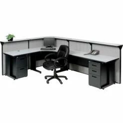 Interion® By Global Industrial reception stations are built for strength, functionality and convenience Ideal for reception rooms and security areas. Reception counters and work surfaces are made using 1 thick scratch resistant laminate. 12″D reception counter provides a convenient writing surface for guest and visitors while maintaining personnel privacy. Desktops include 2-3/16″ diameter cable management grommet opening(s). Desk framing is made of Black finished steel for strength that lasts. Reception station panels consist of Interion® partitions that help reduce noise and create privacy. Reception panels are flame retardant to meet the California 117 flammability standard. These 1-3/4 thick fabric upholstered panels feature an interior engineered wood (MDF) frame and honeycomb core covered with a heavy tackable liner for structural strength and support. Panel trim is finished with self-extinguishing extruded polymer that offers optimum safety and rigidity. Includes adjustable leveling feet that are ideal for uneven surfaces. L-Shaped Reception Station includes 36″ corner desk, a 36″W x 24″D return and a 72″W desk. Desks accept installation of Optional Storage options (sold separately) including Pedestal File, Keyboard Drawer and Mouse Tray. Easy assembly. 1 Year Limited Warranty.