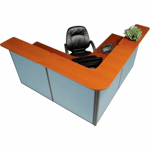 L-Shaped Reception Station, 80″W x 80″D x 44″H, Cherry Counter, Blue Panel