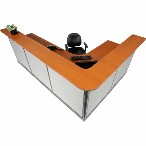 Interion By Global Industrial Interion® L-Shaped Reception Station w/Raceway 116"W x 80"D x 46"H Cherry Counter Gray Panel