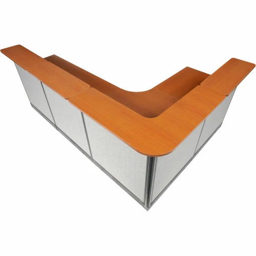 L-Shaped Reception Station With Raceway, 116″W x 80″D x 46″H, Cherry Counter, Gray Panel