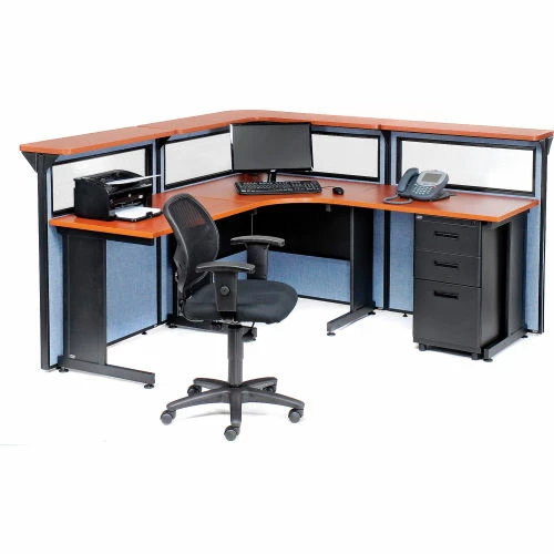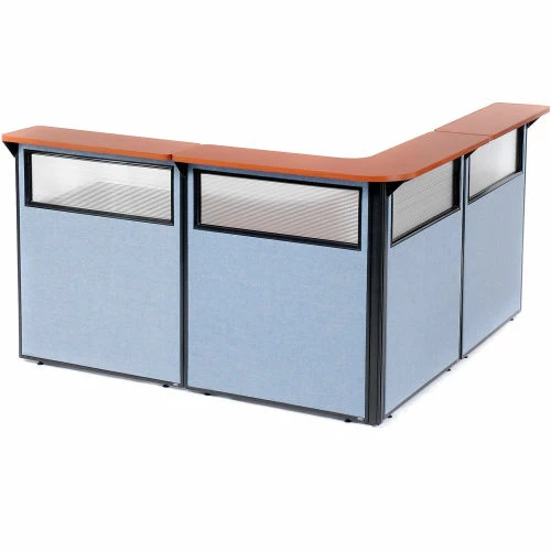 Interion By Global Industrial Interion® L-Shaped Reception Station w/Window 80"W x 80"D x 44"H Cherry Counter Blue Panel