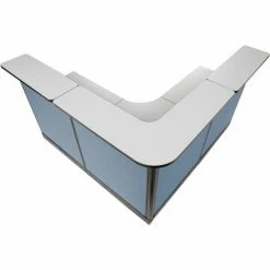 L-Shaped Reception Station With Raceway, 80″W x 80″D x 46″H, Gray Counter, Blue Panel