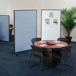 Interion® By Global Industrial Mobile Partition Panels allow you to divide a work area in any office or commercial setting. Each double sided unit has tackable fabric and is flame retardant to meet the California 117 flammability standard. 1-3/4″ thick upholstered panel features an interior engineered wood (MDF) frame and honeycomb core for structural strength and support. Panel trim is finished with self-extinguishing extruded polymer that offers optimum safety and rigidity. Mobile Panels sit atop steel T-legs on sturdy 3″ swivel casters (all locking) that provide full mobility and allow easy transport from area to area. Coordinates with Interion®’s complete line of office partition panels. 1 Year Limited Warranty.
