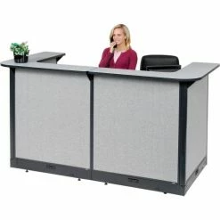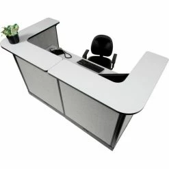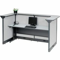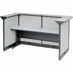 Interion® By Global Industrial reception stations with raceways allow convenient storage of wires & cables while maintaining an attractive, professional appearance. Reception stations are ideal for reception rooms and security areas. Reception counters and work surfaces are made using 1″ thick scratch resistant laminate. 12″D reception counter provides a convenient writing surface for guest and visitors while maintaining receptionist privacy. Desktops include 2-3/16″ diameter cable management grommet opening(s). Desk framing is made of Black finished steel for strength that lasts. Reception station panels consist of Interion® partitions that help reduce noise and create privacy. Reception panels are flame retardant to meet the California 117 flammability standard. 1-3/4″ thick fabric upholstered panels feature an interior engineered wood (MDF) frame and honeycomb core covered with a heavy tackable liner for structural strength and support. Panel trim is finished with self-extinguishing extruded polymer that offers optimum safety and rigidity. Panels feature raceways that provide convenient access for data cables & electrical wiring. 4″H Black powder coated steel raceways include cable management openings for phone & data cables. Removable raceway covers allow easy wiring access. Panels with Electric Raceways feature built-in double-sided power boxes, each with (4) circuit-1 receptacles and modular cables. Each power box can accept up to 6 receptacles; 3 per side (additional Receptacles sold separately). Use included blanks to cover unused openings. Includes adjustable leveling feet that are ideal for uneven surfaces. U-Shaped Reception Station includes a 72″W desk. Desks accept installation of Optional Storage options (sold separately) including Pedestal File, Keyboard Drawer and Mouse Tray. Easy assembly. 1 year warranty.