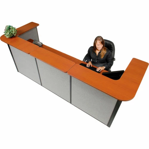 U-Shaped Reception Station, 124″W x 44″D x 44″H, Cherry counter, Gray panel