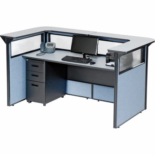 Interion By Global Industrial Interion® U-Shaped Reception Station with Window, 88" W x 44"D x 44"H, Gray counter, Blue Panel